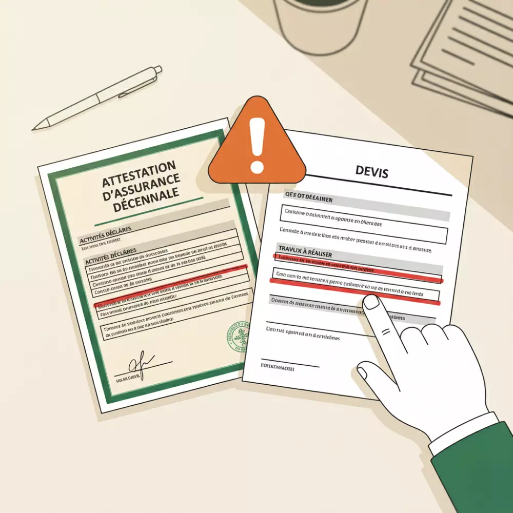 La première confusion concerne l’assurance décennale. Elle est obligatoire pour les entreprises du bâtiment, mais elle ne couvre pas automatiquement tous les travaux réalisés. Chaque entreprise déclare des activités précises à son assureur. Si les travaux effectués ne correspondent pas exactement à ces activités déclarées, l’assurance peut refuser toute prise en charge, même si l’attestation est authentique et en cours de validité. Ce point est largement méconnu des particuliers, qui n’ont ni le réflexe ni les outils pour vérifier la cohérence entre le devis et le périmètre réel de l’assurance.